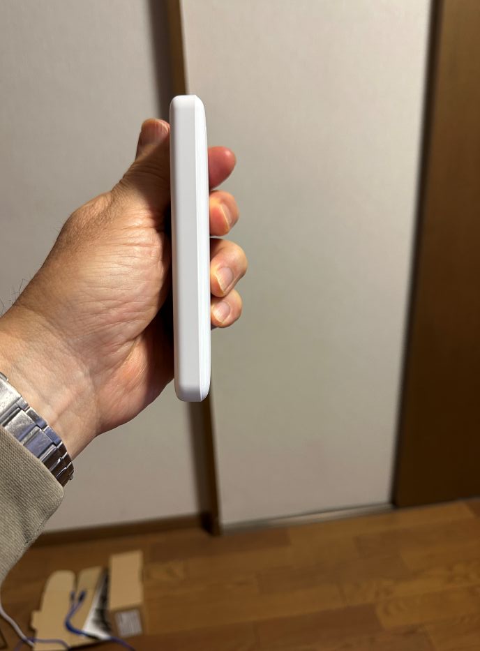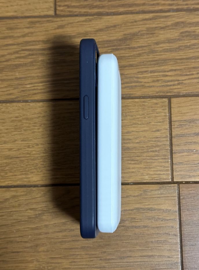 厚みは私のアイホン 14プロをほんの少し厚くした感じですね、ダイソーのWhite&Gold 5000mAh も同じような厚さです。