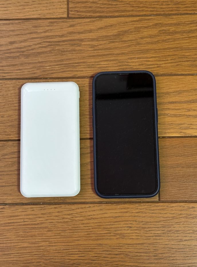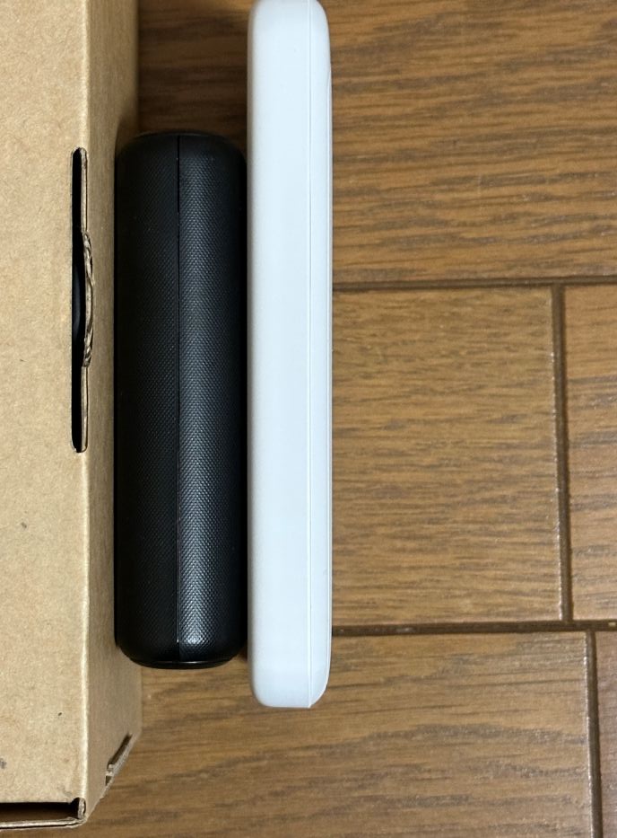 この写真の左側の黒いバッテリーは、私が愛用している数年前に購入した、ELECOM10000mAh のモバイルバッテリーです。 厚さが全然違いますね。