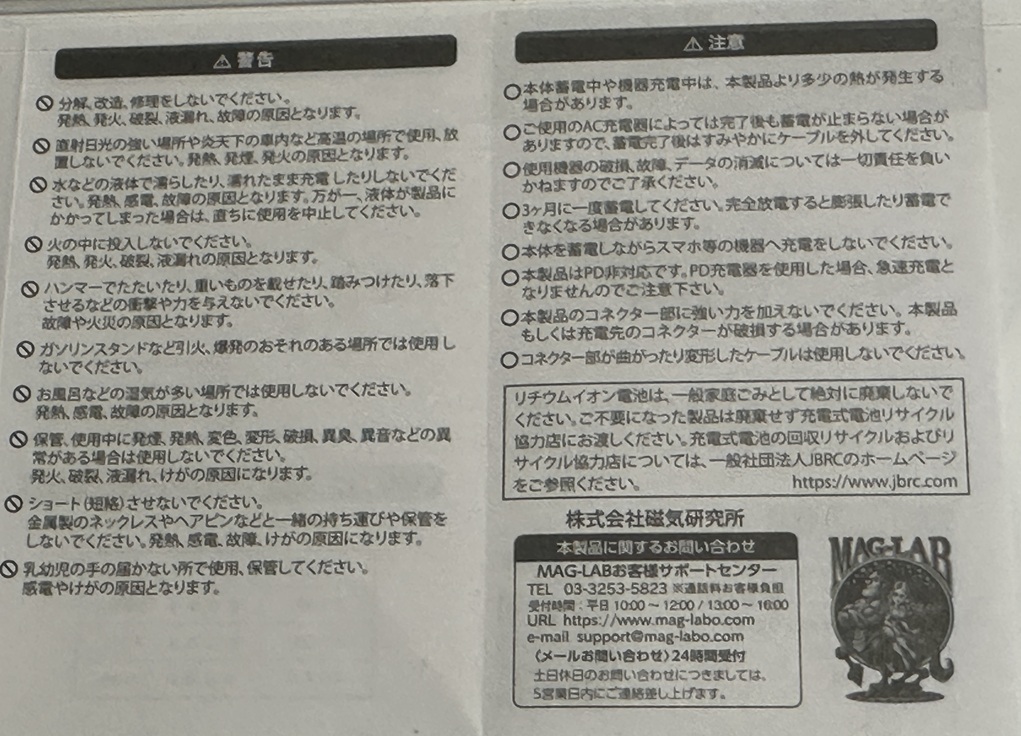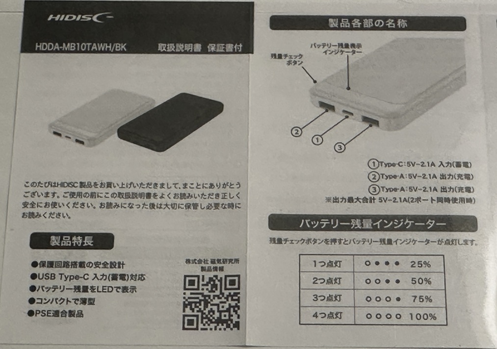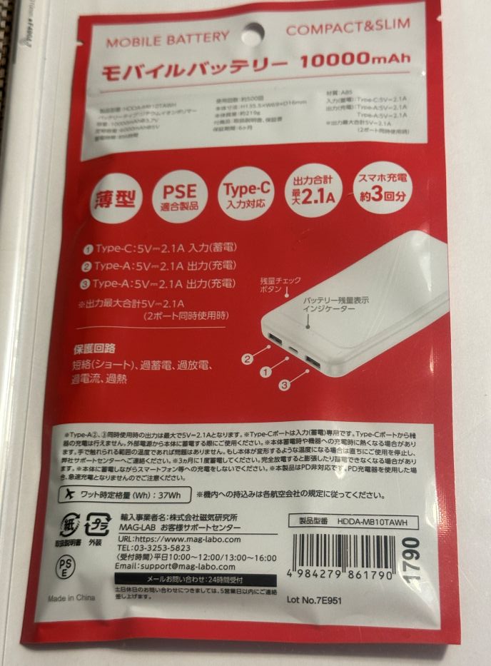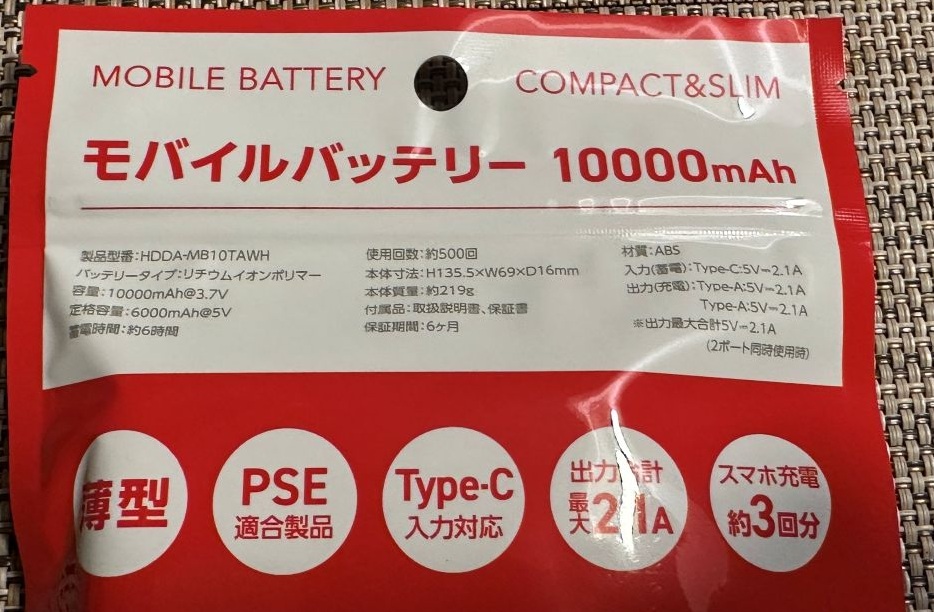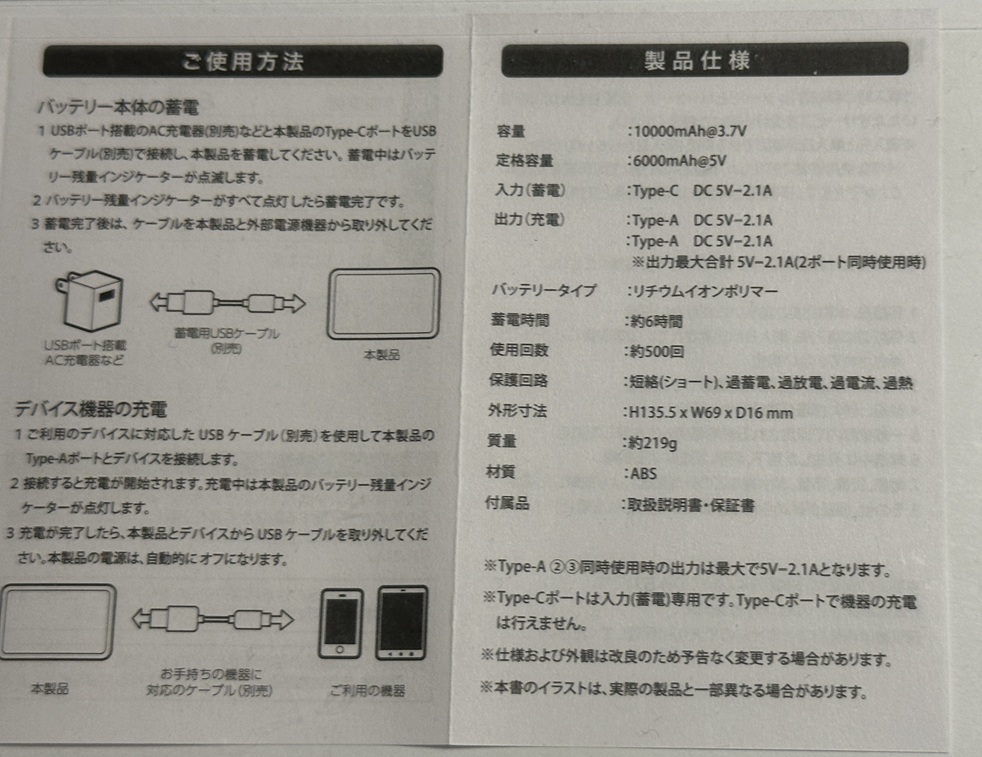 裏面に詳しい写真入りで説明してあるので、非常にわかりやすいですね! 薄型でPSEにも対応して安全です。 Type-Cでバッテリーへ充電、出力は最大で2.1A