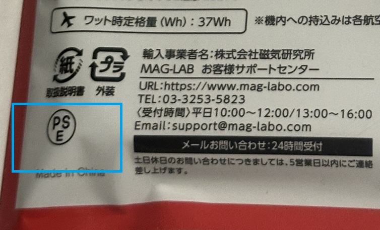 外装の左下、青線枠に囲まれた部分が、PSEマークですね。 まずは日本の安全基準をクリアしていますね。 これがない機器も結構AMAZON等でも販売されているので気を付けてくださいね。この商品は安心 ただし日本国内でのお話し、海外旅行なら各国の基準があってPSEは役に立ちません。 PSEは日本国内の規則です。