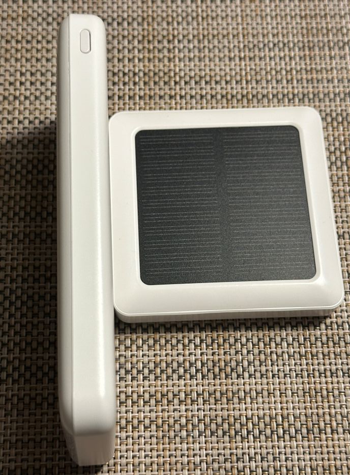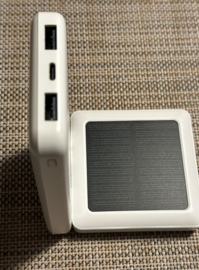 左記黒いマスクの四角い物体は、ダイソー ソーラーパネル付きのモバイルバッテリー、10000mAh単独では立たないために、支えに利用しました。インターフェースはよくある出力:USB-A 2つ