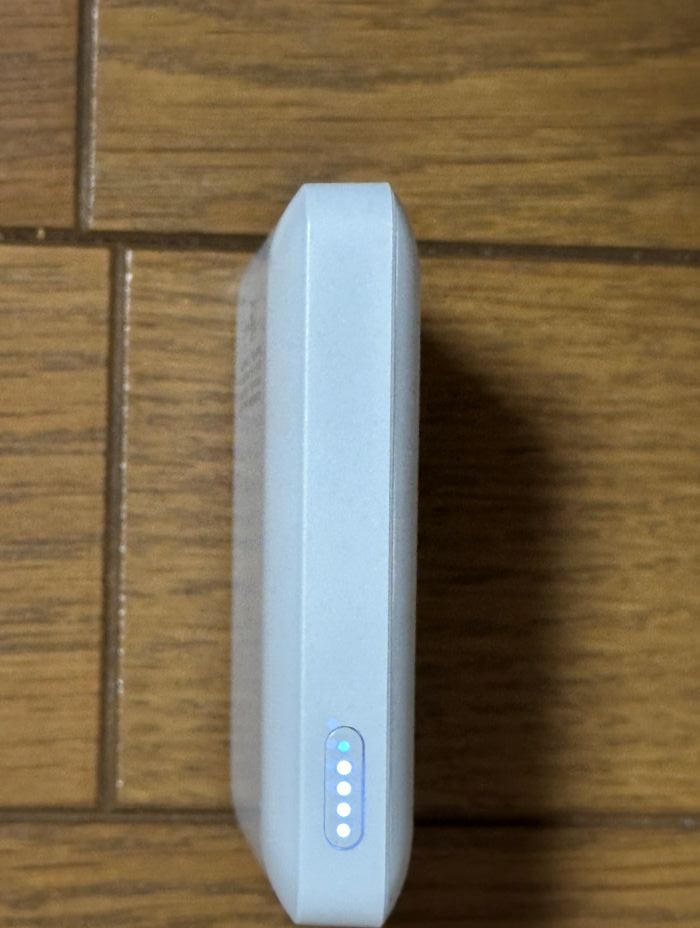 Type-c のインターフェースを使って充電します。充電時はACアダプター等急速充電、PDの充電はサポートしていないので、注意しましょう。 充電中はLEDがあって点滅します。LED4つあって、4つとも点灯したら充電完了です。充電中はLEDが点滅します。 入力 5V*2Vが標準