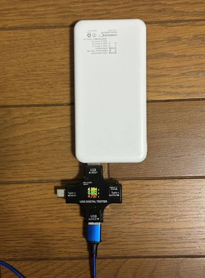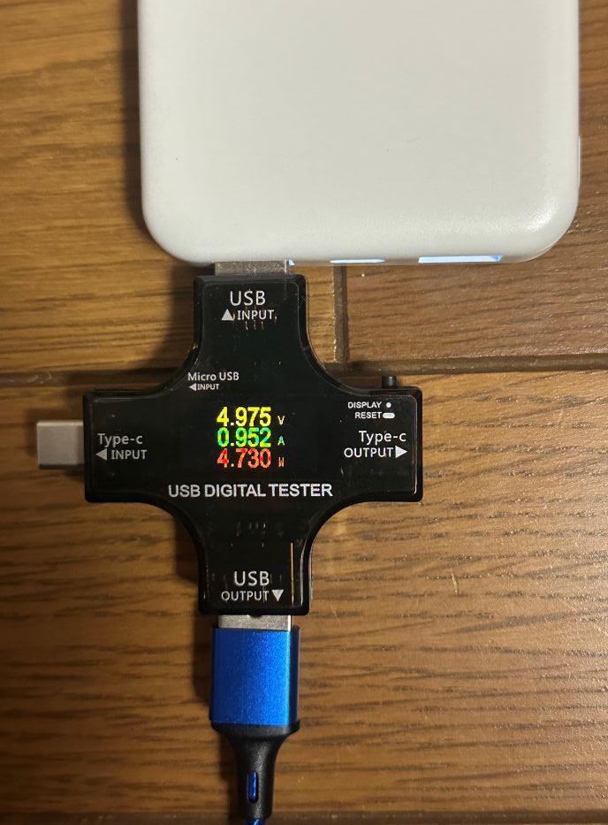 先ほども書いたのですが、コスパが良いANKER POWER BANK 10000mAh 22.5Wh に対して、ダイソーは37Wh 余裕がありそう! 2台同時を試したら報告しますね。1台のスマホを充電するときは下記のような出力になっており、普通に電力が供給されて、問題なく充電しています。