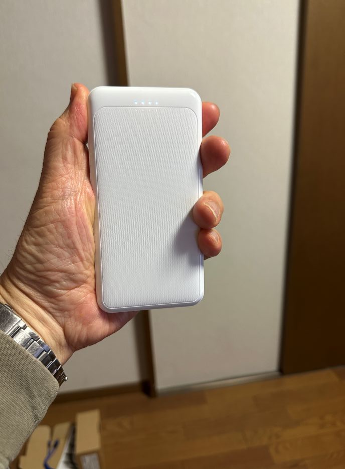 持った感じはスマホをも他のとほぼ同じ感じです。重さも200g程度なので気にならない感じですね。いままではダイソー5000mAhを持って動いてましたが、2倍の容量があって、スリムで重量も200g なので活躍の場がおおいというか、ほとんど5000mAh の出番がなくなる感じがしますね。