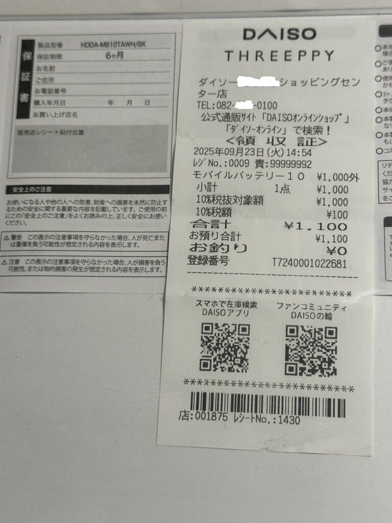 保証書は、パッケージ内の取説に組み込んでありますが、これだといつどこで購入したかがわからないので、必ず購入時のレシートと一緒にしておきましょう。 6か月保証 ANKER等は1年以上保証ありますが、ダイソーは6か月 値段を考慮したら、基本十分!