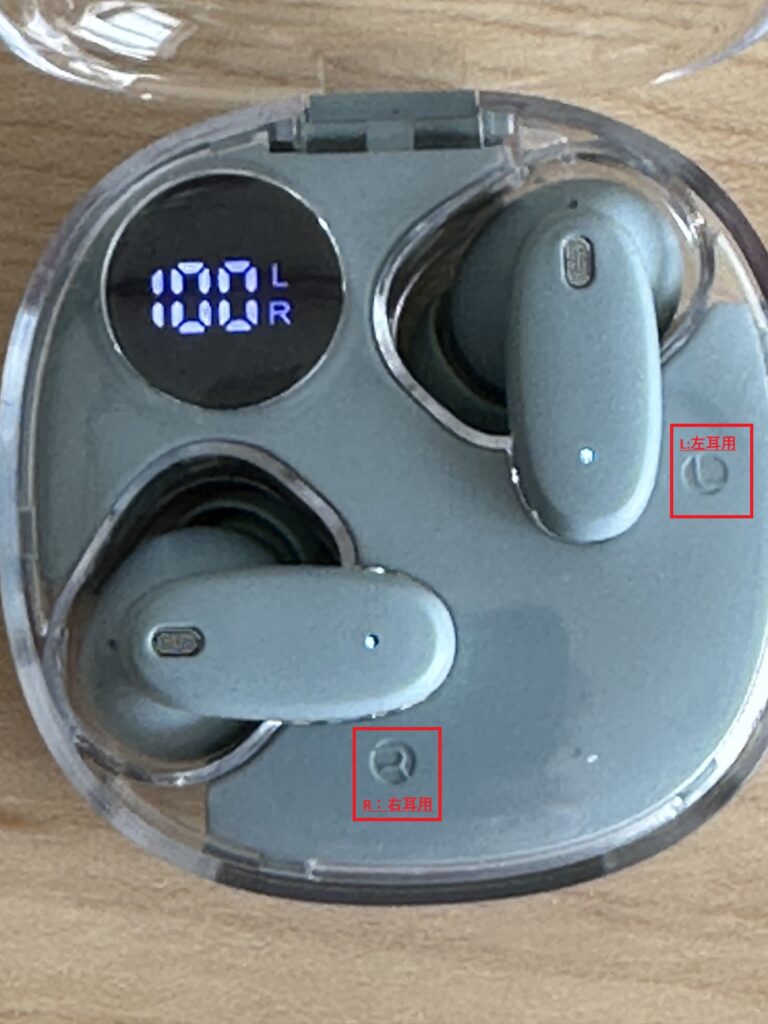 ダイソーイヤホンでバッテリー残量が%数字で表示されるイヤホンは初めてですね。 ケースの左上部 100% のケース側のバッテリー容量を示しており、L Rは イヤホンのLが充電中の印。 気を付けていただきたいのは、普通のケースは右側がイヤホン右なんですが、TWS007はなぜか右側が左 L なんです。 これは要注意ですね。 イヤホンの収納はいたってシンプル。 TWS005はちょっと苦労するので、これはとっても良いです。その分若干ケースが大きくなりましたね。