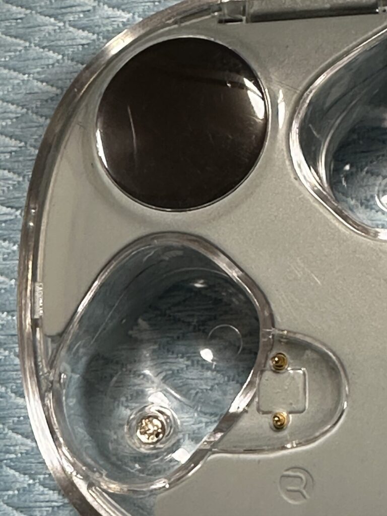 透明ケースと下部ケースの間に入っていた水も抜けてきました。イヤホン本体は水滴の情報がどこにもなく、内部にどれだけ水がたまっているかなので、ただ静かにおいてあり、ケース側の水が抜けたら同様に抜けたはずと仮定して、そこで通電してみる予定です。 防水なしのイヤホン さてどうなることやら。
