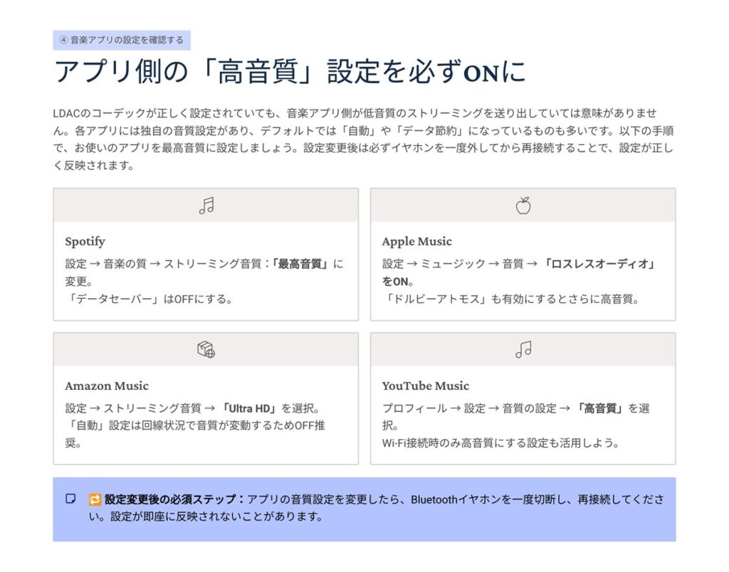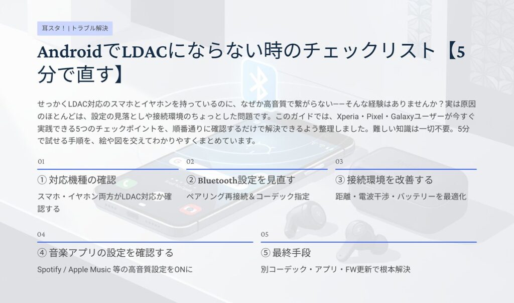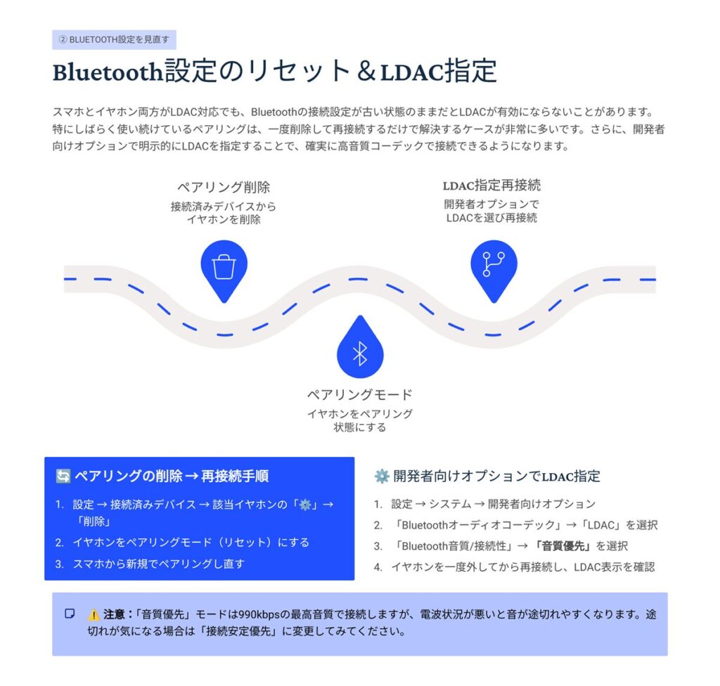 「再ペアリング → LDAC指定 → 音質優先」の順でサクッと確認しましょう。