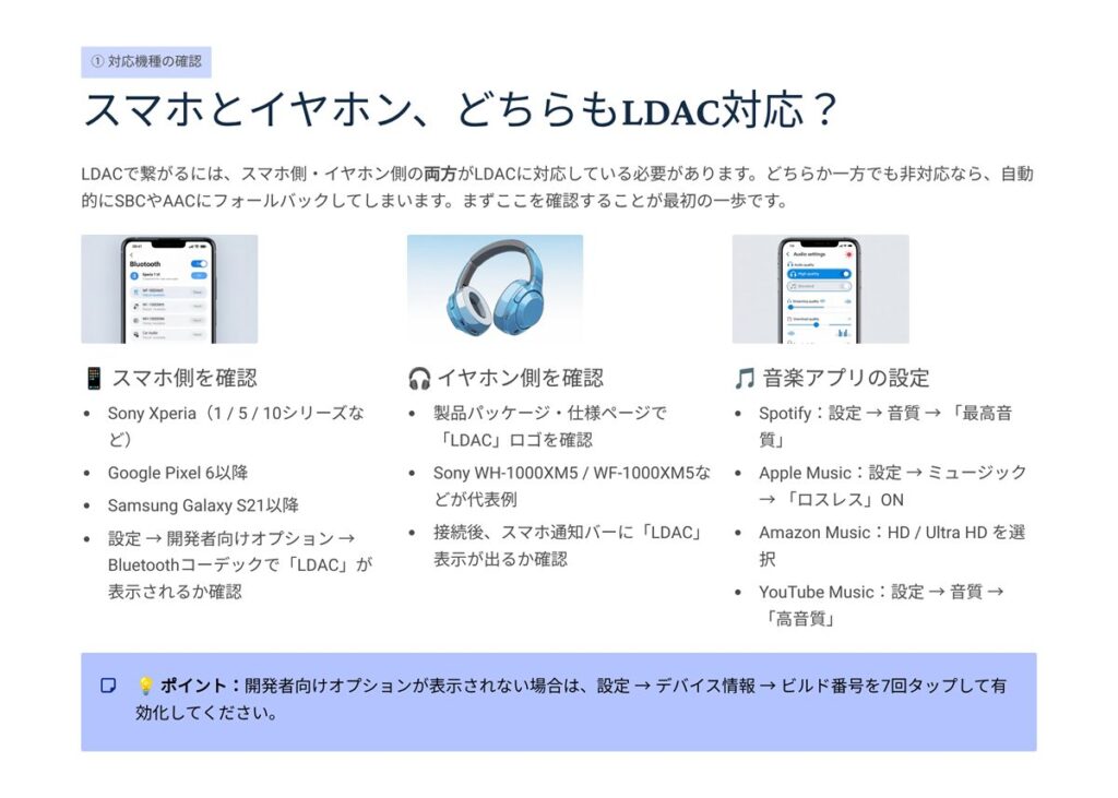 - 注意:「Hi-Res Wireless」だけではLDAC確定ではありません。必ず“LDAC”の文字を確認
