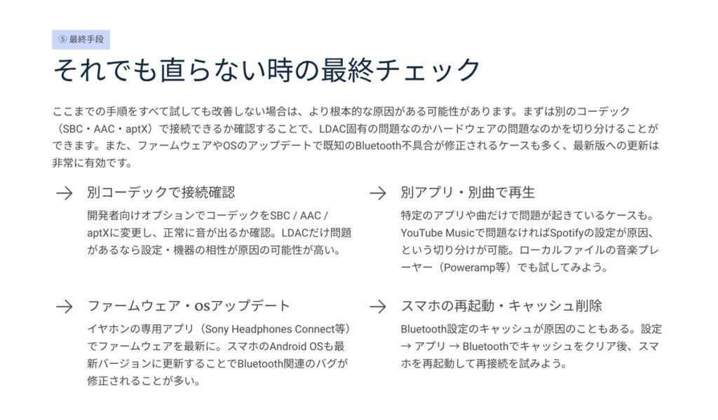 - 改善しない場合は SBC/AAC/aptX に切り替えて症状比較 → LDAC特有か切り分け。
